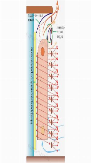 Поясним на примере: Допустим, экран черный; коэффициент поглощения по ИК k = 0,8. Поглощает излучение он с одной стороны, излучает в обе. Теплопроводность материала экрана также не бесконечна. Обратное излучение дополнительно подогреет батарею, она станет излучать сильнее. Точный расчет довольно сложен, требует знания высшей математики, но конечный результат прост: 1, деленная на корень квадратный из 2, умножается на квадрат k. То есть, в комнату уйдет 0,707х0,64 = 0,453 от штатного потока ИК.<