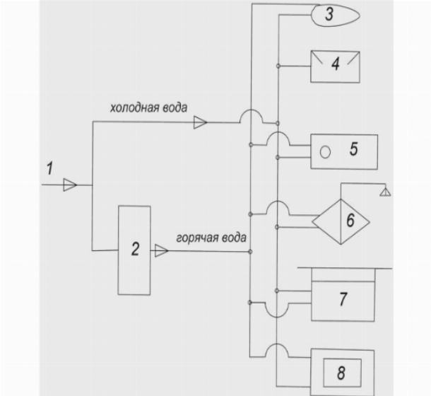 Показано водоснабжение загородного дома. Вода забирается из скважины глубиной 45 м. Поступает в баки предварительной очистки. Применяется 3 бака по 500л. В баках за счет процесса аэрации происходит очистка от железа, сероводорода и частично извести.