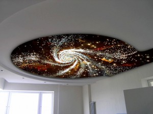 Третий вариант самый простой. Это люминесцентное полотно. На потолок при помощи трафарета наносят рисунок, который ночью светится. Днем рисунки на потолке незаметны, а ночью при легком освещении звезды становятся видны. Потолок с эффектом звездного неба можно сделать в спальне, комнате для детей, ванной или даже гостиной. Он везде будет смотреться гармонично, при наличии соответствующего оформления, мебели и интерьера.