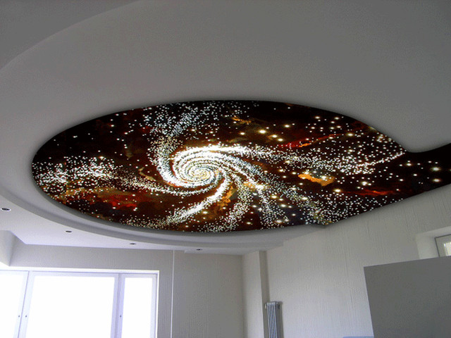 Один из самых популярных дизайнов натяжных потолков – это потолки с эффектом «звездное небо». Такой эффект может достигаться несколькими способами, далее об этом подробнее. Первый вариант потолка в звездах – это использование световодов вместе со светогенератором. Устройство светогенератор соединяется со светодиодами, которые выводятся на внешнее полотно потолка. Светодиоды также крепятся в каркасе для большей прочности, можно создать даже созвездие таким способом, или расположить звезды хаотично, также можно вывести орнамент или любую фигуру. Очень популярный вариант – классическое звездное небо. Количество световодов может быть разным, оно определяет, какая яркость будет у звезд, светогенератор также может реализовать эффект мерцания или перехода из одного цвета в другой. Такие потолки обычно очень нравятся детям, да и некоторые взрослые будут от них в восторге.