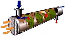Аналогичным образом повышается КПД в теплообменниках, где используются жидкостные теплоносители. Повлиять на характер движения теплоносителя можно за счет использования дополнительных перегородок. Это помогает повысить турбулентность потока, а следовательно и увеличить тепловую производительность за счет интенсификации теплообменных процессов теплоносителя.
