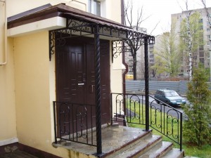 Любая лестница с крыльцом должно выглядеть красиво и привлекательно. Каменная кладка с коваными элементами всегда будет выглядеть импозантно и красиво. Козырек над входной группой можно будет использовать так, чтобы он закрывал полностью пространство, а не только то, что над дверью.